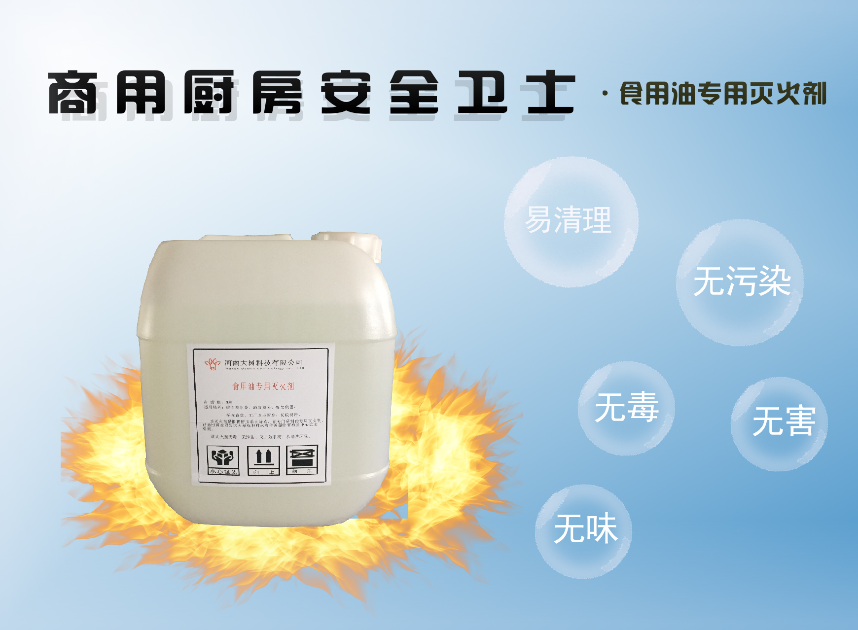 无毒 厨房专用 本公司采用的91视频最新地址剂为厨房专用91视频最新地址剂,该91视频最新地址剂是根据厨房着火特点专门研制的专用91视频最新地址剂。通过雾化喷头喷洒一定量的91视频最新地址剂来达到91视频最新地址效果,喷洒出的91视频最新地址剂与高温油脂接触发生皂化反应,吸收大量热量同时,使油脂表面形成大量泡沫隔离层,隔绝空气,起到91视频最新地址作用。91视频最新地址后随即喷放冷却水,使油脂温度进一步降低至其自身自燃点以下,防止复燃。该91视频最新地址剂具有无毒、无污染、91视频最新地址效率高、91视频最新地址后易清洗等特点。